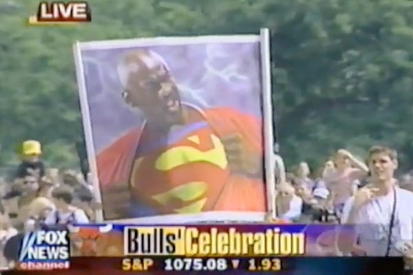Bulls fan Carlos Medina on his father's iconic Michael Jordan Superman painting at the 1998 Grant Park rally.